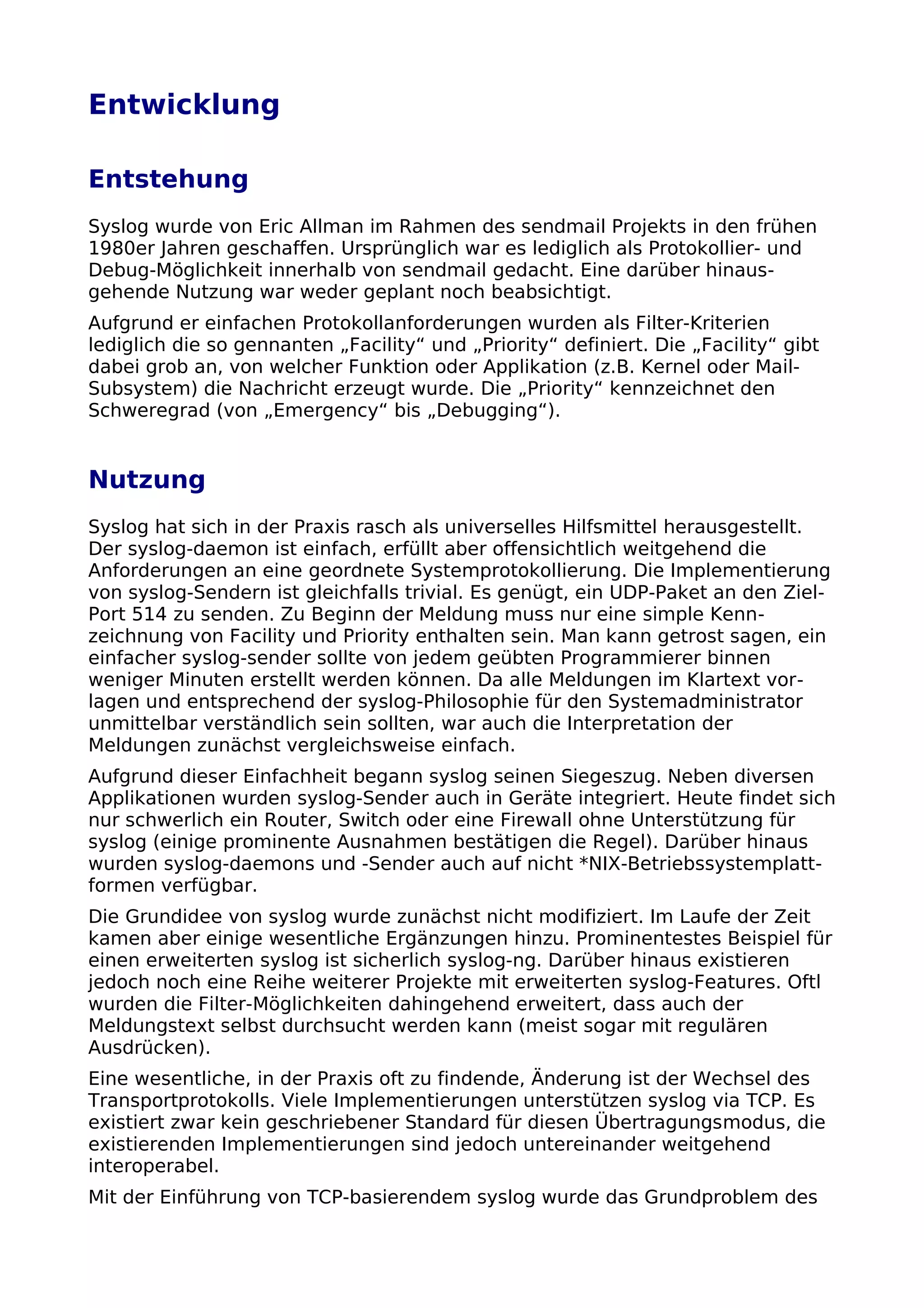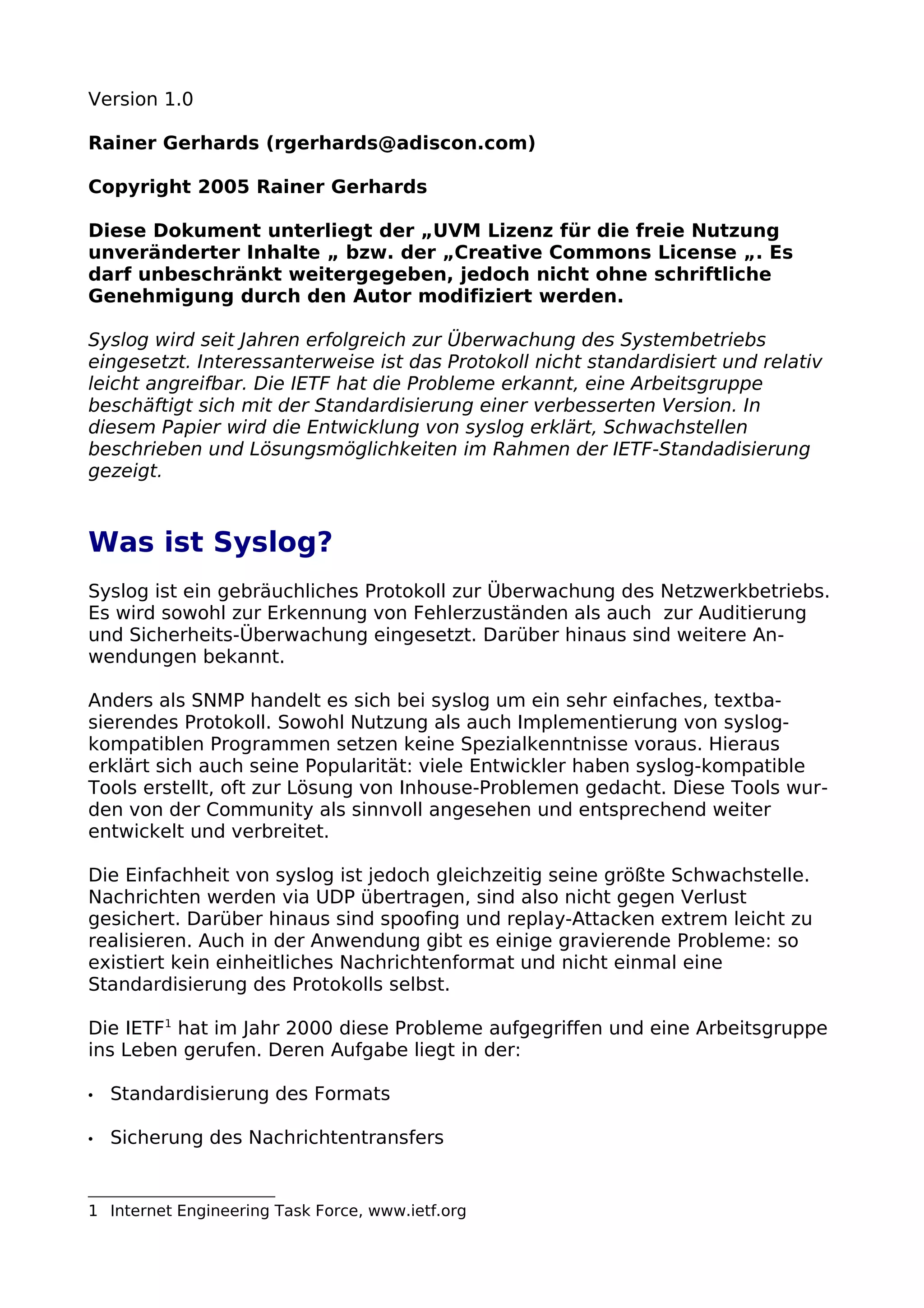 Das Dokument beschreibt die Entwicklung, Nutzung und die Probleme des Syslog-Protokolls, das zur Überwachung von Netzwerkoperationen eingesetzt wird, jedoch aufgrund seiner einfachen Implementierung und fehlenden Standardisierung einige Schwachstellen aufweist. Die IETF arbeitet an der Standardisierung des Protokolls, um Sicherheits- und Übertragungsprobleme zu beheben, während gleichzeitig die einfache Handhabung von Syslog beibehalten werden soll. Historisch gesehen wurde Syslog in den 1980er Jahren entwickelt, hat sich aber ohne einheitliche Standards in der Praxis umfassend verbreitet.