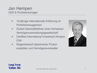 Long Term Value AG bietet Vermögensverwaltung unter Anwendung von bewährten Prinzipien des Value Investing, fokussiert auf systematische Investitionen in unterbewertete Titel. Daten zeigen, dass Aktien die beste Form der Kapitalanlage darstellen, gefolgt von Staatsanleihen, während Immobilien und Bargeld geringere Renditen bieten. Die Gesellschaft legt Wert auf individuelle Betreuung, hohe Flexibilität und eine moderate Gebührenstruktur.