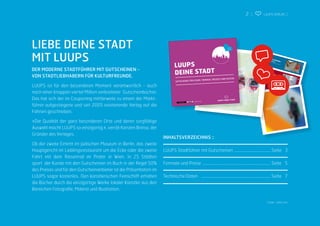 Das Dokument beschreibt die Mediadaten des Luups Verlags für das Jahr 2012, der Stadtführer mit Gutscheinen für verschiedene Aktivitäten in 25 Städten anbietet. Durch die Gutscheine können Kunden in Restaurants, kulturellen Veranstaltungen und Freizeitaktivitäten bis zu 50% sparen. Der Verlag erreicht eine Leserschaft von bis zu 1,5 Millionen pro Jahr, mit einem besonderen Fokus auf städtische Kultur und regionalen Angeboten.