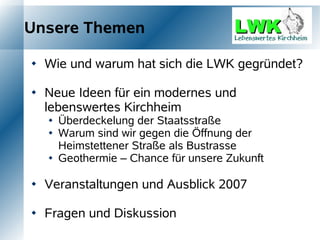 Die Bürgerinitiative 'Lebenswertes Kirchheim' zielt darauf ab, Kirchheim zu einer attraktiven Gemeinde mit hoher Lebensqualität zu entwickeln, indem sie effektive Maßnahmen zur Ortsmitte-Planung, Verkehrssicherheit und umweltfreundlichen Energiekonzepten wie Geothermie fördert. Die Initiative lehnt die Öffnung der Heimstettener Straße als Bustrasse ab und setzt sich für die Sicherheit von Kindern und Senioren ein. Aktuelle Veranstaltungen und Wettbewerbe sollen dazu beitragen, Bürger aktiv in die Gemeindeentwicklung einzubeziehen.
