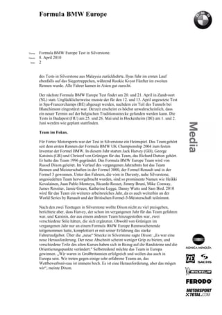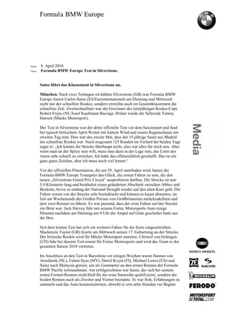 Beim Formula BMW Europe Test in Silverstone am 8. April 2010 führte der 15-jährige Rookie Carlos Sainz mit der schnellsten Zeit, gefolgt von Robert Frijns und Timmy Hansen. Der Test fand unter kalten und regnerischen Bedingungen statt und diente als Vorbereitung auf die bevorstehende Saison, während die Fahrer beeindruckt von der neuen Strecke waren. Der nächste Test ist für den 20. und 21. April in Zandvoort geplant, nachdem der Test in Spa-Francorchamps abgesagt wurde.