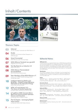 Die April-Ausgabe des M2M Journals thematisiert die Herausforderungen und Chancen von M2M-Technologien, insbesondere im Kontext von Industrie 4.0 und dem Internet der Dinge. Eine Studie zeigt, dass Standards und Sicherheitsaspekte entscheidend für die Akzeptanz von M2M-Lösungen sind, obwohl viele private Anwendungen wie Smart Home und Carsharing bereits hohe Bekanntheit, jedoch geringe Nutzung aufweisen. Zudem werden neue Trends und Entwicklungen im Bereich smarter Lösungen auf der Hannover Messe 2015 vorgestellt.