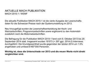 Die aktuelle Publikation 'Mach 2015-1' von Mediaschneider AG stellt die Leserschaftsdaten der Schweizer Presse zwischen 2000 und 2015 vor, basierend auf einer Befragung von 19.573 Personen. Neu in dieser Ausgabe sind die Leserschaftsentwicklungen von Koch- und Weinzeitschriften sowie Motorradzeitschriften, ergänzt durch eine Erhöhung der Grundgesamtheit um 1,0% im Vergleich zur letzten Publikation. Die Änderungen in den Daten vor und nach 2013 sind nicht direkt vergleichbar.