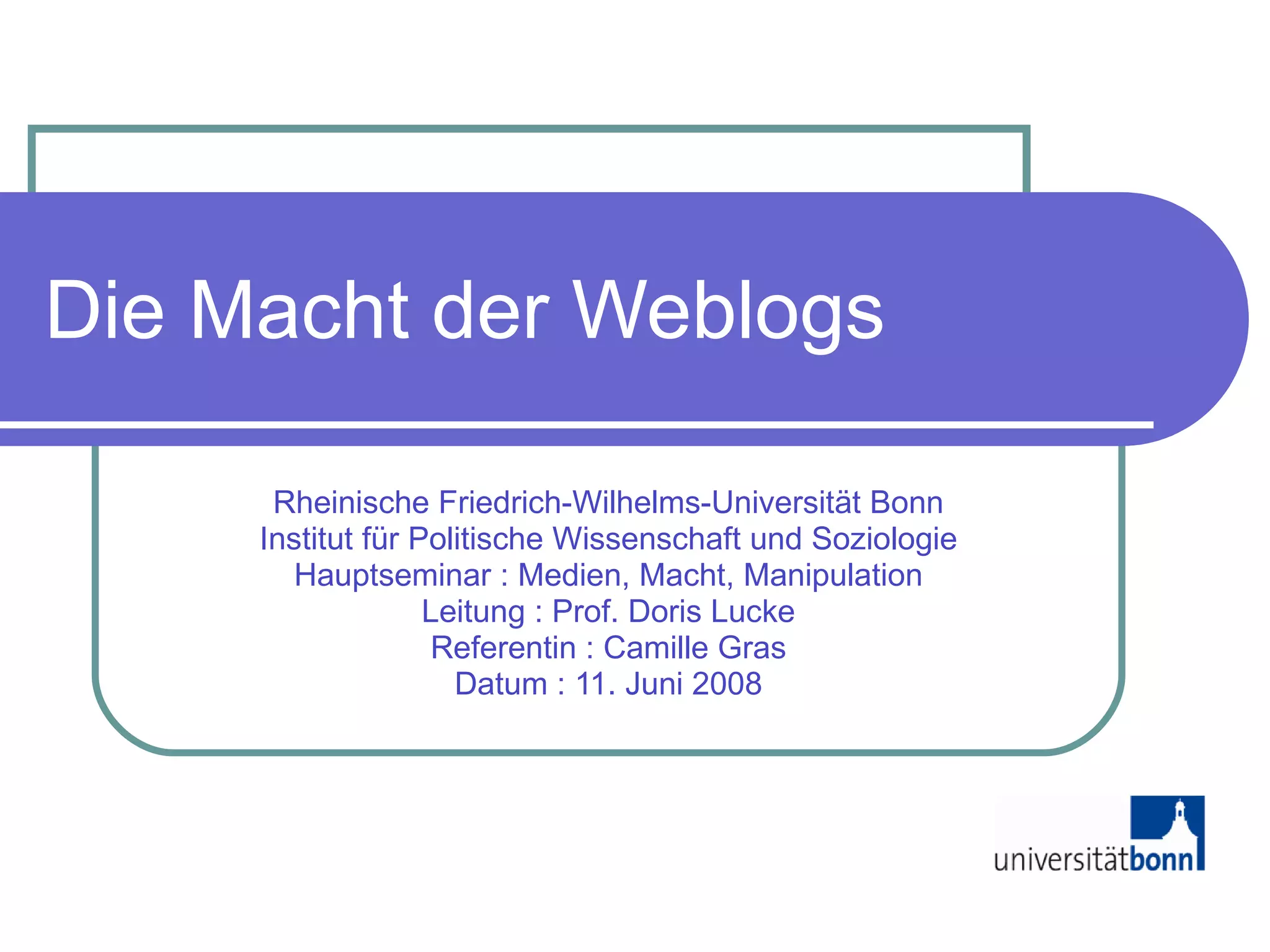 Das Dokument behandelt die Auswirkungen von Blogs auf Politik und Wirtschaft, insbesondere nach dem Boom seit dem 11. September 2001. Es beleuchtet den Einfluss von Blogs auf Massenmedien und Bürgerjournalismus sowie die Rolle von professionellen Journalisten in der neuen Medienlandschaft. Zudem wird die Frage aufgeworfen, ob Blogs eine Gefahr oder Chance für traditionelle Medien darstellen.