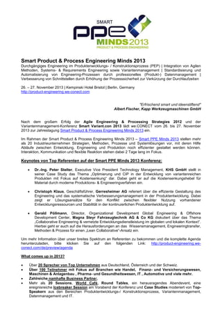 Die Veranstaltung "Smart Product & Process Engineering Minds 2013" findet am 26. und 27. November 2013 in Berlin statt und legt den Fokus auf die Integration von agilen Methoden, Systems- und Requirements Engineering sowie Variantenmanagement, um die Effizienz im Produktentwicklungsprozess zu steigern. Über 20 Expertenreferenten werden Strategien und Lösungen präsentieren, die den Austausch von Ideen und Erfahrungen fördern. Die Konferenz bietet zahlreiche Gelegenheiten zum Networking, einschließlich interaktiver Sessions und Case Studies, um aktuelle Herausforderungen und Lösungen im Engineering-Bereich zu diskutieren.