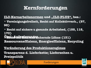 Das Dokument behandelt Strategien zur Verbesserung sozialer Standards, insbesondere durch freiwillige Verhaltenskodizes und die Einhaltung internationaler Arbeitsnormen wie den ILO-Kernarbeitsnormen. Es beleuchtet Herausforderungen und Potenziale der fairen öffentlichen Beschaffung sowie die Rolle der Konsumentenmacht und die Notwendigkeit eines aktiven Engagements der Verbraucher. Zudem wird auf aktuelle Entwicklungen und organisatorische Initiativen hingewiesen, die sich für faire Arbeitsbedingungen und gegen Missstände in der globalen Wirtschaft einsetzen.