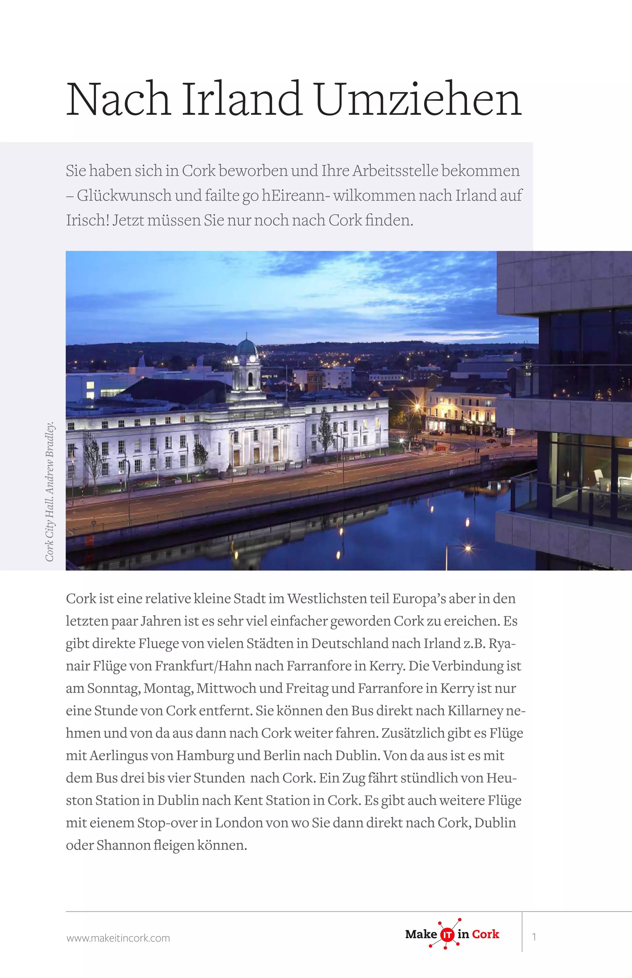 Das Dokument bietet Informationen für Personen, die nach Cork, Irland, umziehen möchten, einschließlich Unterkunftsmöglichkeiten, Transport, Bankkontoeröffnung und Krankenversicherung. Es beschreibt auch kulturelle Aktivitäten, Freizeitmöglichkeiten und das gesellige Leben in der Stadt, einschließlich traditioneller irischer Pubs und sportlicher Betätigungen. Darüber hinaus werden regionale Feste und kulinarische Höhepunkte hervorgehoben, wodurch Cork als lebendige und einladende Stadt dargestellt wird.