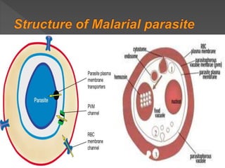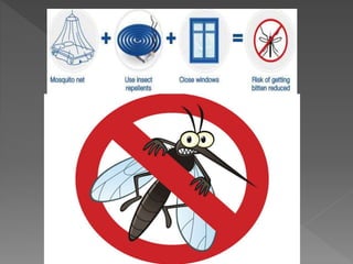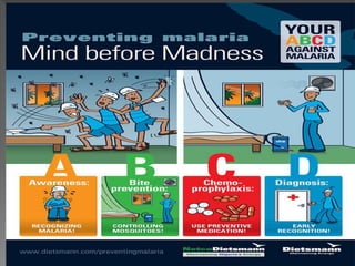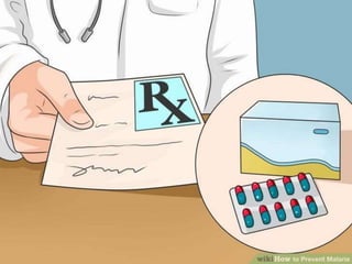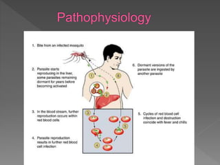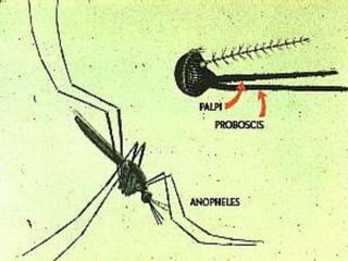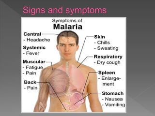 Malaria is a mosquito-borne infectious disease caused by Plasmodium parasites. It is transmitted via the bites of infected Anopheles mosquitoes. The most common symptoms of malaria include fever, chills, and flu-like illness. There are four species of malaria parasite that infect humans - P. falciparum, P. vivax, P. ovale, and P. malariae. Treatment involves antimalarial medications such as chloroquine and primaquine. Prevention focuses on mosquito control measures like insecticide spraying and source reduction as well as the use of insecticide-treated bed nets.