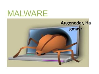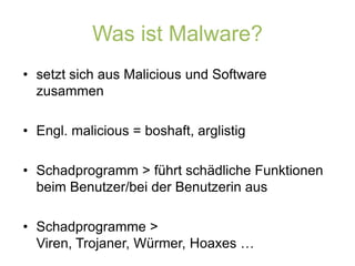 Das Dokument erklärt den Begriff 'Malware', der sich aus den Worten 'malicious' und 'software' zusammensetzt, und beschreibt verschiedene Arten von Schadsoftware wie Viren, Würmer, Trojaner und Hoaxes. Viren verbreiten sich durch Programme, während Würmer sich selbstständig über E-Mails verbreiten und Trojaner sich als nützliche Programme tarnen, um Benutzerdaten zu stehlen. Hoaxes sind gezielte Falschmeldungen, die zwar harmlos sind, aber als wahr missverstanden werden können.
