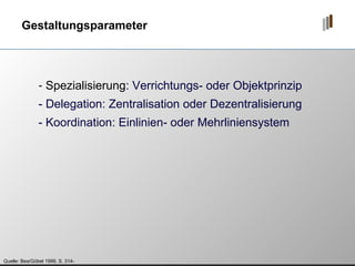 Das Dokument beschreibt verschiedene Organisationsmodelle und ihre Gestaltungsparameter, einschließlich Spezialisierung, Delegation und Koordination. Es werden die drei Grundmodelle der Organisation - funktionale, divisionale und Matrixorganisation - sowie alternative Ansätze wie Netzwerk- und virtuelle Organisationen erklärt. Jedes Modell wird anhand spezifischer Merkmale und Strukturen detailliert begleitet von Quellenangaben.