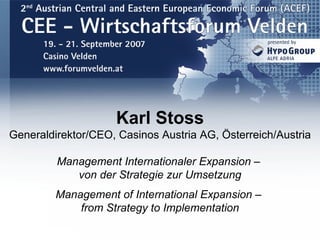 Dr. Karl Stoss behandelt in seinem Vortrag die Verantwortung und Strategien des Managements bei der internationalen Expansion, betont die Notwendigkeit aktiven Handelns und sorgfältiger Analyse. Casinos Austria, als führendes Glücksspielunternehmen, verfolgt eine nachhaltige Wachstumspolitik durch verschiedene strategische Ansätze zur Marktpenetration und -entwicklung. Wichtige Erfolgsfaktoren sind klar definierte Ziele, erfahrenes Management und die Fähigkeit zur Anpassung an unterschiedliche Märkte und Kulturen.