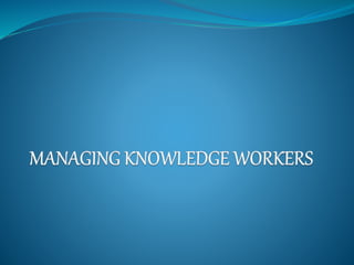 This document discusses different types of knowledge workers (KWs) including core KWs, non-core KWs, specialty KWs, portable KWs, and creative KWs. It also outlines core competencies of KWs such as thinking skills, continuous learning, innovative teams and teamwork, innovation and creativity, and risk-taking. Approaches to rewarding KWs are discussed, including total reward policies, recognition and praise, career structures, and pay flexibility. Finally, factors that can limit KWs' productivity are presented, like time constraints, working smarter vs harder, unrelated tasks, work schedules, and lack of motivation.