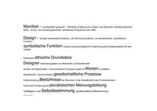 Das Dokument behandelt verschiedene Manifeste, die sich mit sozialen, politischen und ethischen Aspekten von Design und Kommunikation auseinandersetzen. Es beleuchtet die Verantwortung von Designern gegenüber der Gesellschaft, die Kritik an wirtschaftlichen Interessen sowie den Aufruf zu kollektiver Kreativität und Selbstreparatur. Darüber hinaus wird die Bedeutung von offenem Zugang zu Informationen und der Widerstand gegen autoritäre Strukturen hervorgehoben.
