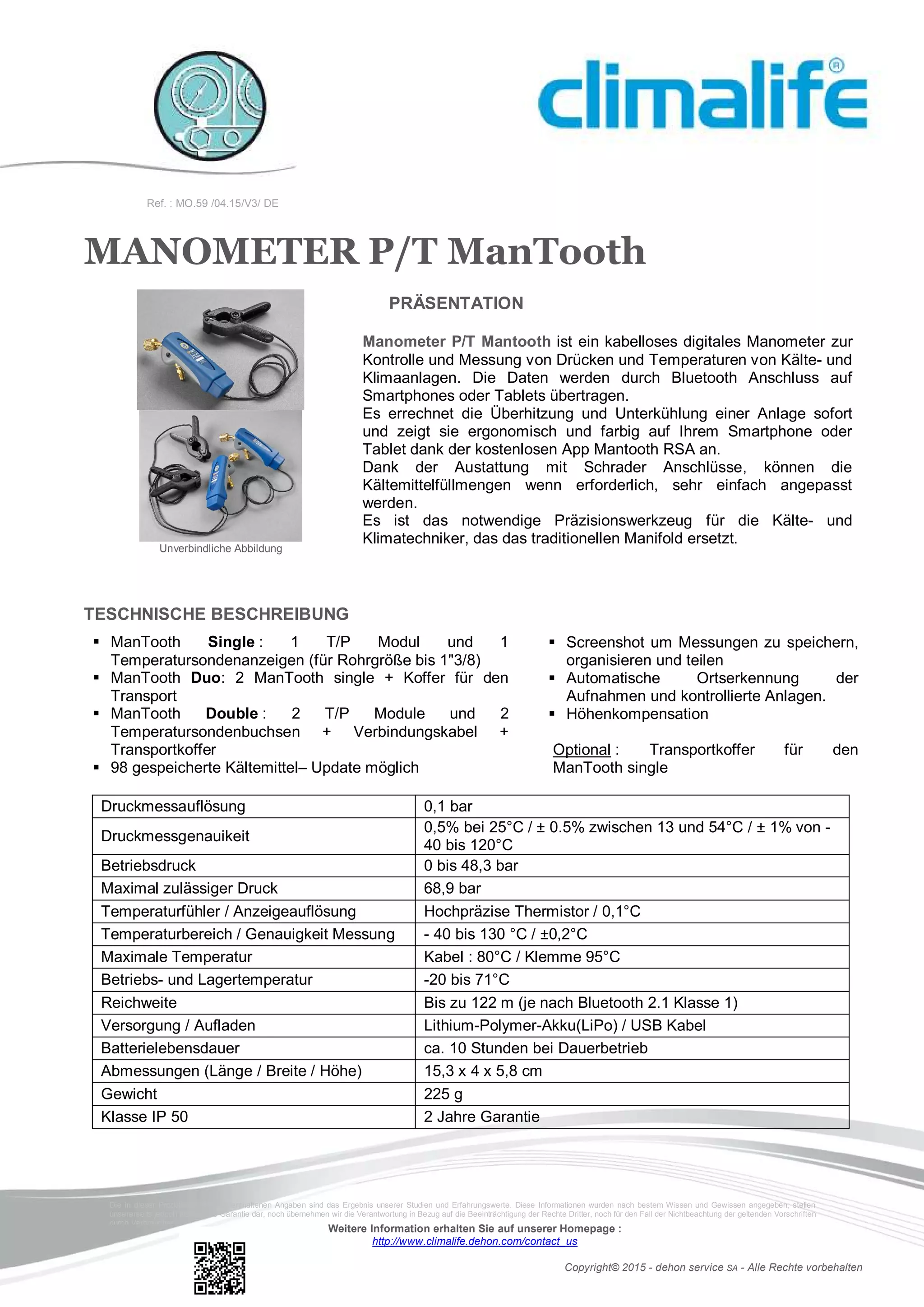 Das Dokument beschreibt das kabellose digitale Manometer Mantooth zur Kontrolle von Druck und Temperatur in Kälte- und Klimaanlagen, das Daten via Bluetooth an Smartphones überträgt. Es enthält technische Spezifikationen, einschließlich der Messgenauigkeit, Temperaturbereiche und Betriebseigenschaften. Das Manometer ersetzt traditionelle Manifolds und ist ein essentielles Werkzeug für Kälte- und Klimatechniker.