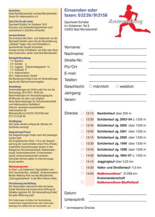 Der 11. Bad Münstereifeler Halbmarathon findet am 29. August 2009 statt und umfasst verschiedene Laufveranstaltungen, darunter ein Bambinilauf, Schülerläufe und einen Halbmarathon über 21,098 km. Anmeldungen sind bis zum 30. Juni 2011 online oder per Fax möglich, Nachmeldungen sind am Veranstaltungstag bis zu 60 Minuten vor dem Lauf erlaubt. Im Zielbereich gibt es vielfältige Verpflegungsmöglichkeiten und ein Rahmenprogramm für die Teilnehmer.