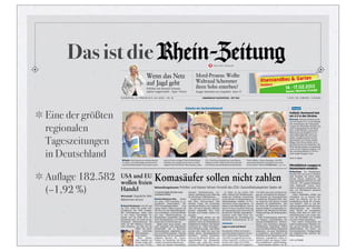 Das Dokument berichtet über verschiedene Themen, darunter einen Mordprozess und politische Debatten in Deutschland, sowie über den Fußball, speziell das Champions-League-Spiel zwischen Borussia Dortmund und Shakhtar Donetsk. Es wird auch auf den Skandal um Pferdefleischprodukte in Deutschland eingegangen und diskutiert, wie die Zahl alkoholbedingter Notfälle bei Jugendlichen ansteigt. Zudem sind soziale Medien und die digitale Präsenz der Rhein-Zeitung aufgeführt, mit Informationen über ihre Nutzung und eine neue Paywall-Regelung für Online-Inhalte.