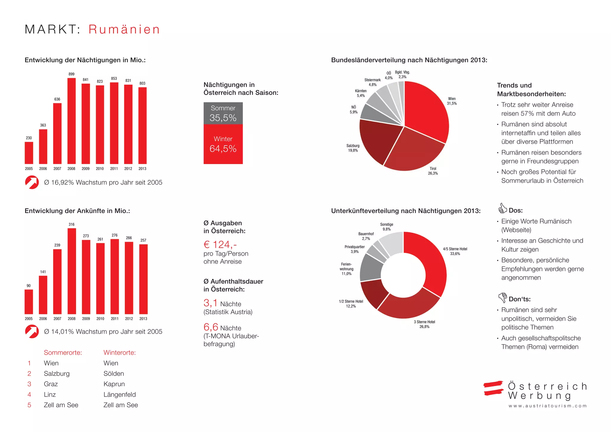 Das Dokument analysiert die Nächtigungen von rumänischen Touristen in Österreich im Jahr 2013 und beschreibt Trends sowie Marktbesonderheiten. Rumänen reisen bevorzugt in Gruppen, sind internetaffin und zeigen Interesse an Geschichte und Kultur, während sie politische Themen vermeiden. Es werden verschiedene Marketingaktivitäten und Kampagnen vorgestellt, um rumänische Gäste in den Wintermonaten sowie zu Familienaktivitäten im Sommer anzusprechen.