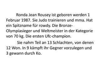 Ronda Rousey, geboren am 1. Februar 1987, ist eine erfolgreiche MMA-Kämpferin und die erste weibliche UFC-Champion, die ihre Karriere mit 12 von 13 gewonnenen Kämpfen begann. Sie war Olympiamedaillengewinnerin im Judo und erlangte Berühmtheit durch ihre dominante Leistungen in der UFC, bis sie 2015 ihren ersten Kampf gegen Holly Holm verlor. Neben ihrer Sportkarriere trat sie auch in Filmen wie 'Die Unbesiegbaren 3' und 'Fast & Furious 7' auf.