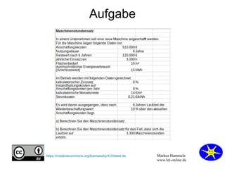Die Aufgabe von Markus Hammel befasst sich mit Maschinenstundensätzen und deren Berechnung. Er bietet sowohl die Aufgabenstellung als auch die Lösungen an, die auf seiner Webseite verfügbar sind. Die Inhalte sind unter einer Creative Commons Lizenz zugänglich.