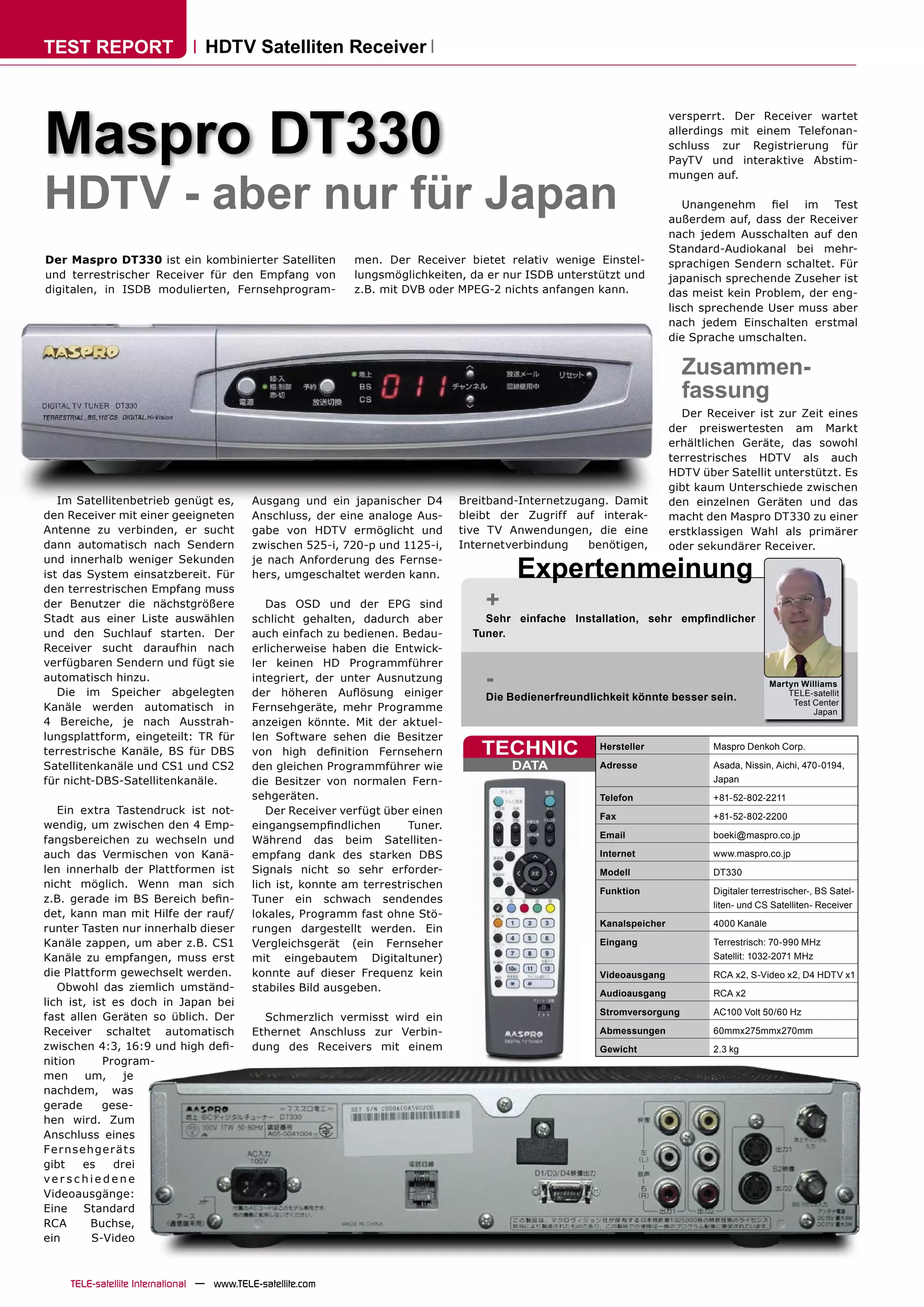 Der Maspro DT330 ist ein kostengünstiger HDTV-Satellitenreceiver, der sowohl terrestrisches als auch Satellitenfernsehen unterstützt, jedoch nur ISDB-Standards nutzt. Er bietet eine einfache Installation und Benutzerfreundlichkeit, leidet jedoch unter Einschränkungen wie dem Fehlen eines integrierten HD-Programmführers und der Notwendigkeit, die Sprache nach jedem Einschalten zu wechseln. Zudem können interaktive TV-Anwendungen nicht genutzt werden, da ein Internetzugang erforderlich ist, der nicht vorhanden ist.