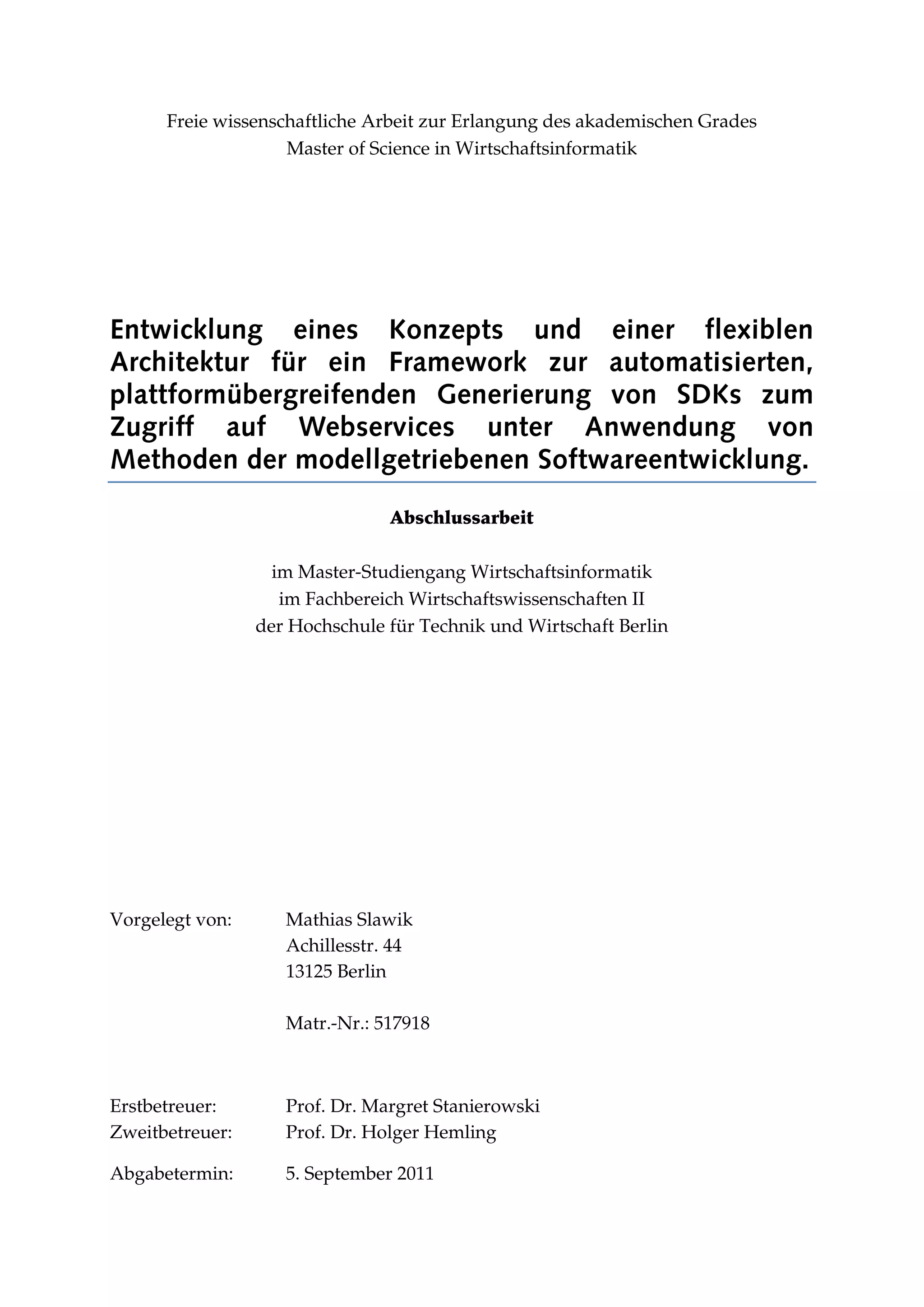 Die wissenschaftliche Arbeit von Mathias Slawik behandelt die Entwicklung eines Frameworks namens "generationrest" zur automatisierten, plattformübergreifenden Generierung von SDKs für den Zugriff auf REST-Webservices unter Anwendung modellgetriebener Softwareentwicklung. Die Arbeit analysiert bestehende Technologien und Methoden, konzipiert ein allgemein gültiges Metamodell und stellt die Flexibilität des Frameworks in prototypischen Implementierungen nach. Abschließend werden die Ergebnisse mit bestehenden Frameworks verglichen und ein Ausblick auf die künftige Entwicklung des Frameworks gegeben.