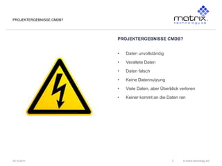 Das Dokument beschreibt die Herausforderungen und Probleme bei der Einführung und Pflege von Configuration Management Database (CMDB), einschließlich unvollständiger und veralteter Daten sowie falscher Annahmen über die Notwendigkeit von Change Management. Es legt dar, wie das Configuration Management-Team organisiert ist und welche Prozessschnittstellen bestehen, und schlägt Workshops und Beratung an, um die CMDB zu optimieren. Zudem werden die Integration und Automatisierung von Datenpflege hervorgehoben, um die Datenqualität zu verbessern.