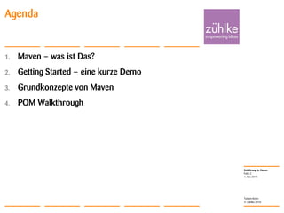 Das Dokument bietet eine Einführung in Maven, ein Build-Tool zur Verwaltung von Abhängigkeiten und zur Automatisierung von Build-Prozessen in Java-Projekten. Es erklärt die grundlegenden Konzepte wie Projektobjektmodelle (POM), Koordinaten, Abhängigkeiten, Plugins und den Build-Lifecycle sowie nützliche Maven-Befehle. Zudem wird eine Schritt-für-Schritt-Demonstration zur Erstellung und Verwaltung eines neuen Maven-Projekts bereitgestellt.