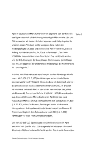 Im April 2009 lieferte Mercedes-Benz Cars weltweit 90.900 Fahrzeuge aus, was einem Rückgang von 24 % im Vergleich zum Vorjahr entspricht, während die Marke Mercedes-Benz 80.700 Einheiten verkaufte. In China erzielte Mercedes-Benz mit 5.600 Fahrzeugen einen Rekordabsatz, während die neue E-Klasse in Deutschland Marktführer im Segment war. Trotz eines schwierigen Marktes wuchs der Absatz in Brasilien um 48 % und in Kanada um 21 %.