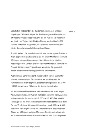 Im September 2009 verzeichnete Mercedes-Benz Cars mit 114.300 verkauften Fahrzeugen den besten Absatz des Jahres, trotz eines Rückgangs im Vergleich zum Vorjahr. Besonders die neue E-Klasse trug maßgeblich zu den positiven Verkaufszahlen bei, während auch in Märkten wie China und Südkorea hohe Zuwächse erzielt wurden. Dr. Joachim Schmidt betont den stabilen Marktanteil von Mercedes-Benz im Premiumsegment und die Bedeutung der neuen S-Klasse für die zukünftigen Verkaufsimpulse.