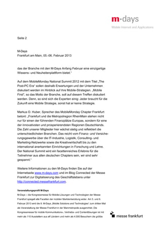 Die M-Days 2013, eine Kongressmesse für mobile Lösungen und Technologien, finden am 5. und 6. Februar in Frankfurt statt und werden von der Messe Frankfurt ausgerichtet. Im Vorfeld wird am 19. November der MobileMonday National Summit veranstaltet, bei dem über 200 Teilnehmer erwartet werden, um mobile Strategien in der Post-PC-Ära zu diskutieren. Die M-Days bieten eine Plattform mit mehr als 110 Ausstellern und einem breiten Themenspektrum rund um das mobile Internet.