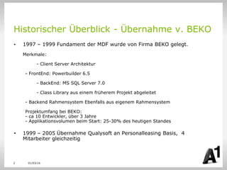 Das Dokument gibt einen Überblick über die Entwicklung des MDF-Systems von seiner Gründung durch die Firma Beko bis zur Übernahme durch Qualysoft. Es beschreibt die technischen Merkmale, die Teamgröße sowie die wesentlichen Fortschritte in den Bereichen Workflow Management und Integration mit anderen Systemen. Darüber hinaus wird die Entwicklung von 1997 bis 2005 skizziert, einschließlich der Aufstockung des Personals.