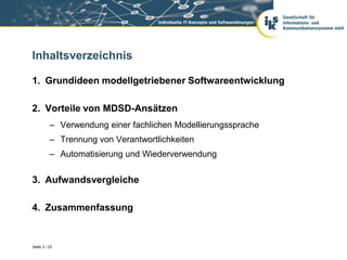 Das Dokument behandelt die grundlegenden Ideen und Vorteile der modellgetriebenen Softwareentwicklung (MDSD), einschließlich der Verwendung fachlicher Modellierungssprachen zur Verbesserung der Entwicklungseffizienz und Softwarequalität. Es beschreibt die Automatisierung und Wiederverwendung durch generative Ansätze, die zu stabileren Softwarearchitekturen führen. Zudem werden Aufwandsvergleiche zwischen manueller Entwicklung und MDSD angestellt, die die Effizienzsteigerung durch MDSD verdeutlichen.