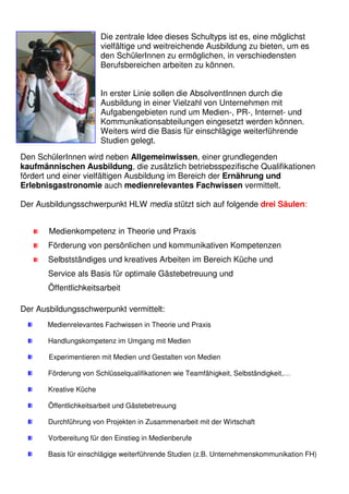 Das Dokument beschreibt die Ausbildungsinhalte und -ziele eines Bildungsgangs in Unternehmenskommunikation und Medienmanagement, welcher auf eine vielfältige berufliche Einsetzbarkeit in Medien-, PR- und Kommunikationsabteilungen abzielt. Die Ausbildung kombiniert allgemeine kaufmännische Kenntnisse mit medienrelevantem Fachwissen und fördert persönliche sowie kommunikative Kompetenzen durch praxisnahe Projekte. Zusätzlich wird der Umgang mit modernen Medien und Technologien als zentraler Bestandteil der Ausbildung hervorgehoben.