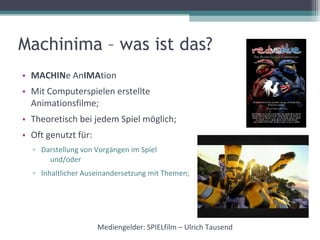 Der Workshop unter der Leitung von Ulrich Tausend beschäftigt sich mit Machinima, einer Technik zur Erstellung von Animationsfilmen mit Computerspielen, um Jugendlichen kreative Mediennutzung und das Handwerk des Filmemachens näherzubringen. In einem zweitägigen Programm erarbeiten Schüler Storyboards, drehen und schneiden ihre Filme, die Themen aus ihrer Lebenswelt aufgreifen, wobei die Ergebnisse durch hohe Motivation und Erfahrungen mit dem Spiel 'Die Sims 2' beeinflusst werden. Filmprojekte wurden in Kooperation mit verschiedenen Schulklassen durchgeführt und alle Filme sind auf YouTube verfügbar.