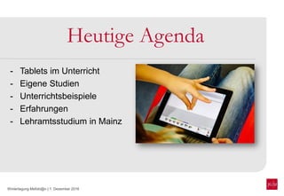 Die Wintertagung an der JGU Mainz am 1. Dezember 2016 thematisierte die Integration von Tablets in den Unterricht, basierend auf verschiedenen Projekten und Studien. Es wurde festgestellt, dass Tablets das Lernen durch individuelle Studien und kreative Anwendungen unterstützen können, jedoch keinen schlechten Unterricht ersetzen. Die Lehramtsausbildung an der JGU umfasst medienpädagogische Inhalte, um Lehrkräfte auf den Einsatz digitaler Medien vorzubereiten.