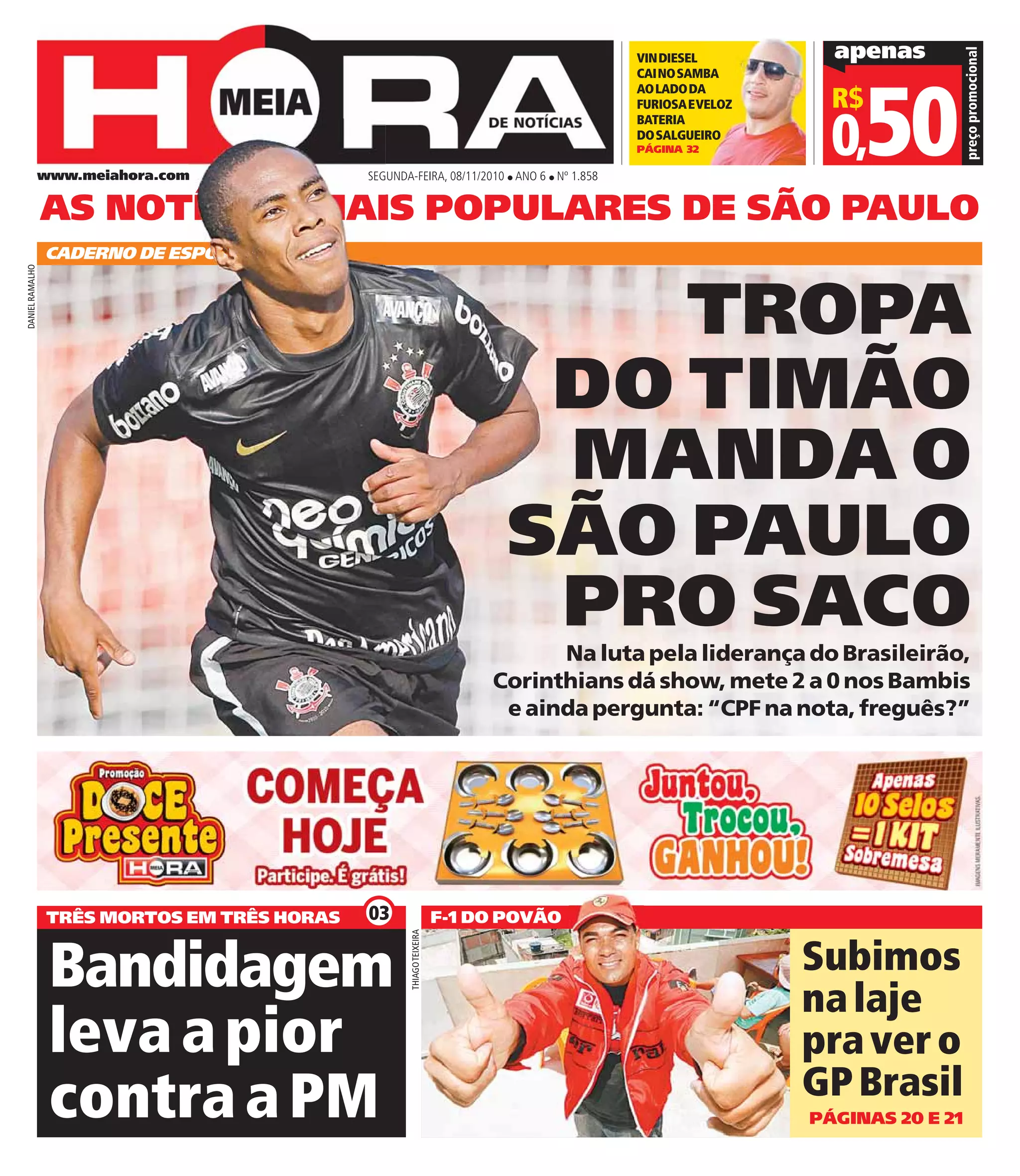 Das Dokument berichtet über einen Sieg des Corinthians im Fußball, der das Team in der Führung des Campeonato Brasileiro weiter stärkt. Es werden auch andere Themen, wie die Gewalt in São Paulo, angesprochen. Zudem enthält das Dokument Informationen zu den beliebtesten Nachrichten in der Stadt.
