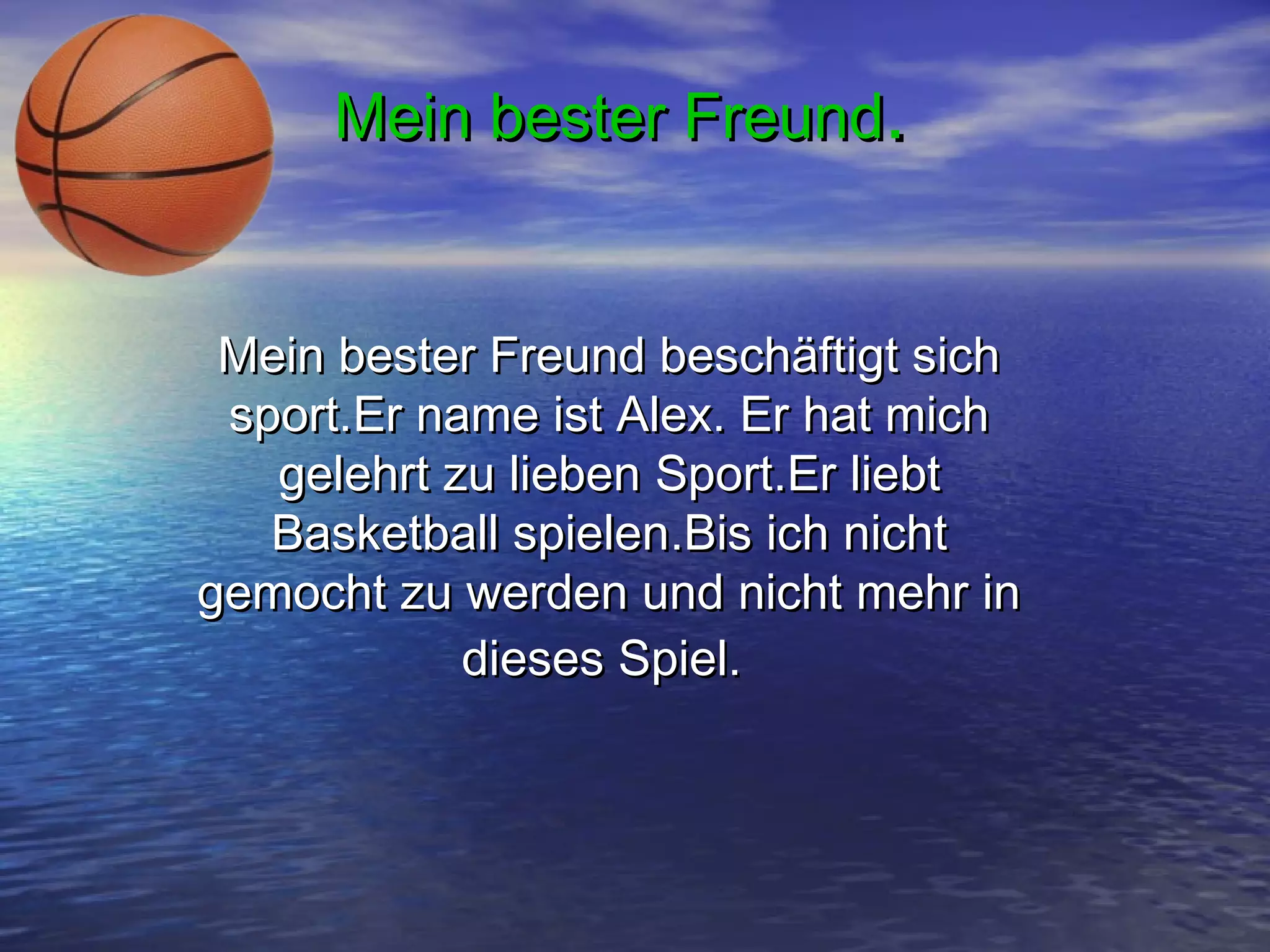 Der Autor beschreibt seinen besten Freund Alex, der ihm die Leidenschaft für Basketball beigebracht hat. Basketball ist ein Mannschaftssport, bei dem zwei Teams versuchen, den Ball in den Korb des Gegners zu werfen und dabei Punkte zu erzielen. Trotz anfänglicher Schwierigkeiten im Sport hat der Autor durch Basketball Fortschritte gemacht und empfiehlt jedem, diesen Sport auszuprobieren.
