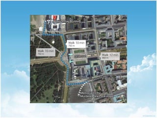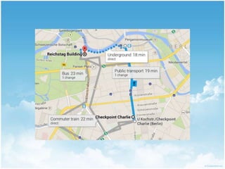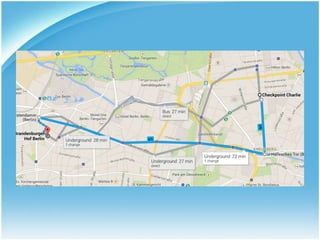 Das Dokument beschreibt einen Tag in Berlin und listet verschiedene Sehenswürdigkeiten und Orte wie das Hotel Brandenburger Hof, den Checkpoint Charlie, das Reichstagsgebäude, das Denkmal für die ermordeten Juden Europas, den Tiergarten, das Schloss Charlottenburg, das Kaufhaus des Westens (KaDeWe) und den Berliner Fernsehturm auf.
