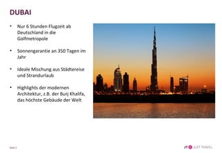 Das Dokument präsentiert fünf romantische Urlaubsziele: Dubai, bekannt für seine moderne Architektur und Strandurlaub; Teneriffa, die 'Insel des ewigen Frühlings' mit traumhaften Stränden; Kreta, die größte griechische Insel mit kulturellen Sehenswürdigkeiten; Mallorca, eine beliebte Baleareninsel mit schönen Küsten; und Italien, das ideale Ziel für Kultur- und Strandliebhaber. Jedes Ziel bietet eine Vielzahl von Erholungsmöglichkeiten und ist von Deutschland aus in kurzer Flugzeit erreichbar. Weitere Informationen sind auf der Website von JT Touristik zu finden.