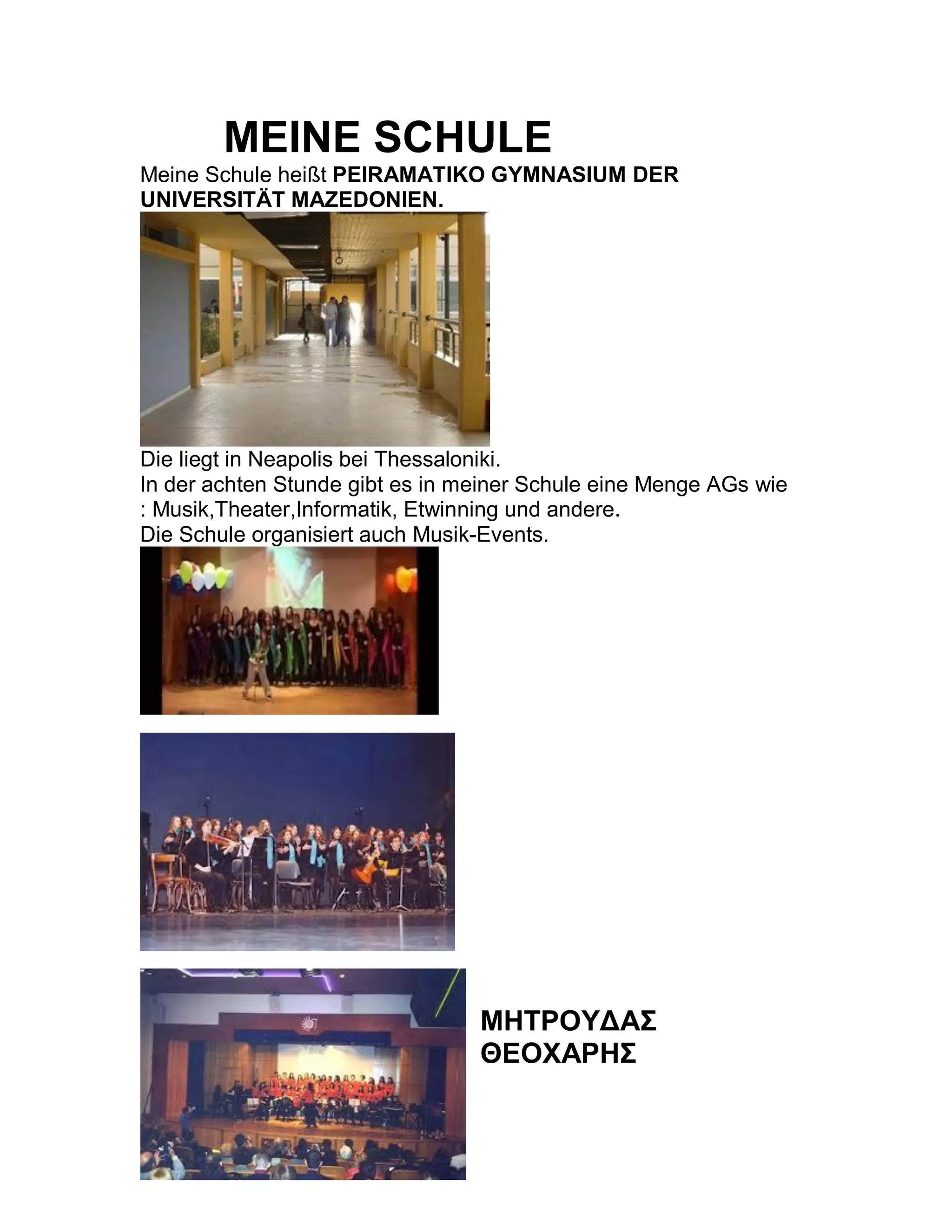 Meine Schule ist das Peiramatiko Gymnasium der Universität Mazedonien in Neapolis bei Thessaloniki. In der achten Stunde gibt es viele AGs wie Musik, Theater und Informatik, und die Schule organisiert auch Musik-Events.