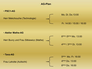 Das Dokument beschreibt die verschiedenen AG-Angebote am Froehlichen Gymnasium Sissonne, einschließlich der Zeiten und Lehrkräfte. Die AGs umfassen unter anderem Mathe, Tanz, Wissenschaft, Musik, Theater und Schwimmen. Jede AG hat spezifische Tage und Zeiten, an denen sie für unterschiedliche Klassenstufen angeboten wird.