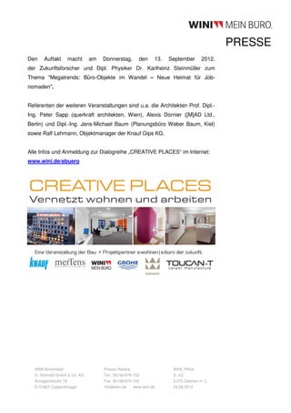 Im September 2012 startet die exklusive Event-Reihe "creative places - vernetzt wohnen und arbeiten" im Berliner e-wohnhaus, organisiert von Wini Büromöbel und mehreren Partnern aus der Bau- und Möbelindustrie. Die fünfteilige Dialogreihe thematisiert innovative Architektur und neue Wohnstandards, bietet hochkarätige Vorträge sowie Diskussionsrunden und geführte Rundgänge an. Die Auftaktveranstaltung wird von Dr. Karlheinz Steinmüller am 13. September eröffnet, gefolgt von weiteren renommierten Referenten.