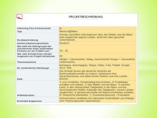 Das Dokument beschreibt ein eTwinning-Projekt 2016/2017, in dem Musik das beliebteste Hobby darstellt und verschiedene Teilnehmer ihre Interessen und Hobbys teilen. Es werden Informationen über neue Projektfreunde gegeben, darunter ihre Vorlieben und Hintergründe. Zusätzlich werden Aktivitäten während des Jahres skizziert, die von Gesprächen und Brainstorming bis hin zu Videoaufnahmen reichen.