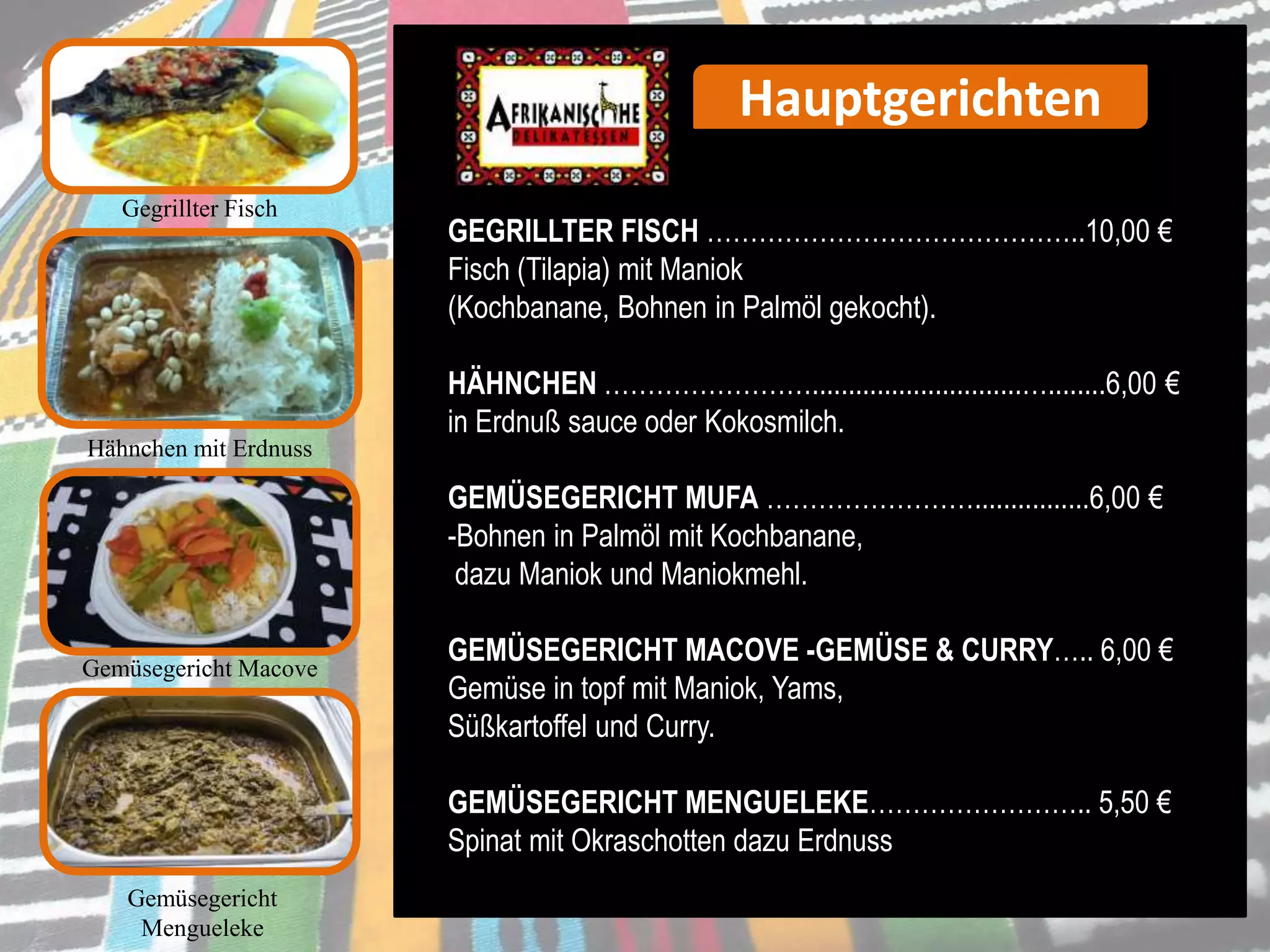 Das Dokument beschreibt eine Speisekarte mit verschiedenen Gerichten, darunter Hähnchen, gegrillter Fisch, Gemüsegerichte und afrikanische Gulaschgerichte zu Preisen zwischen 3,00 € und 110,00 €. Es werden auch verschiedene Beilagen und die Möglichkeit eines Buffet-Services für Gruppen ab 20 Personen angeboten. Zusätzlich wird auf die Option von Desserts und speziellen Anfragen hingewiesen.