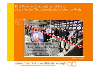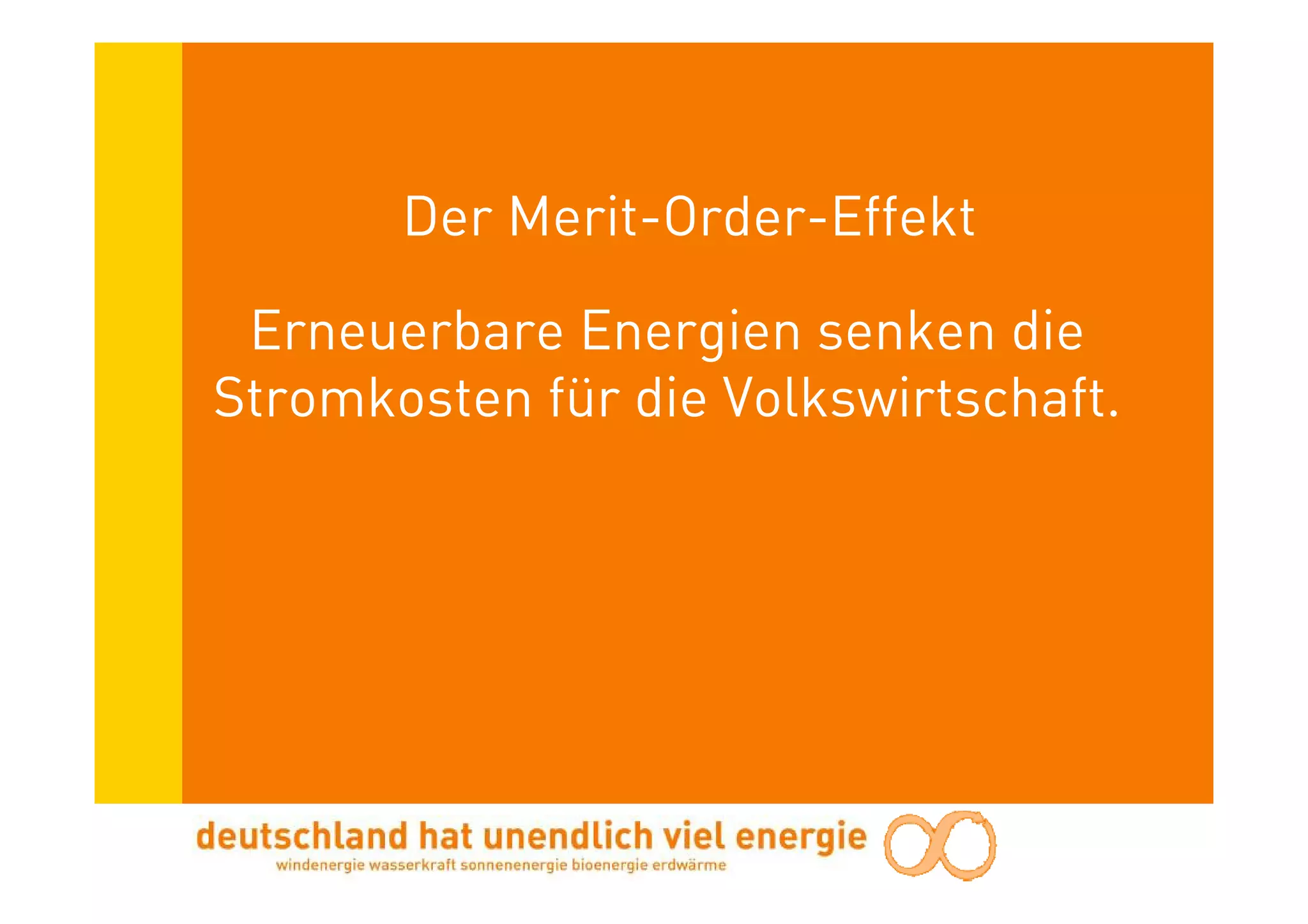 Der Merit-Order-Effekt erneuerbarer Energien senkt die Stromkosten für die Volkswirtschaft, da ihre Einspeisung die Nachfrage nach teurerem konventionellem Strom reduzieren kann. Trotz einer gesamtwirtschaftlichen Entlastung, die 2008 auf 3,8-4,0 Milliarden Euro geschätzt wurde, werden die Vorteile durch geringen Wettbewerb in der Energiebranche nur teilweise an die Verbraucher weitergegeben. Die Förderung erneuerbarer Energien hat dabei nicht nur finanzielle Nutzen, sondern auch positive Effekte auf Beschäftigung und Energieimporte.