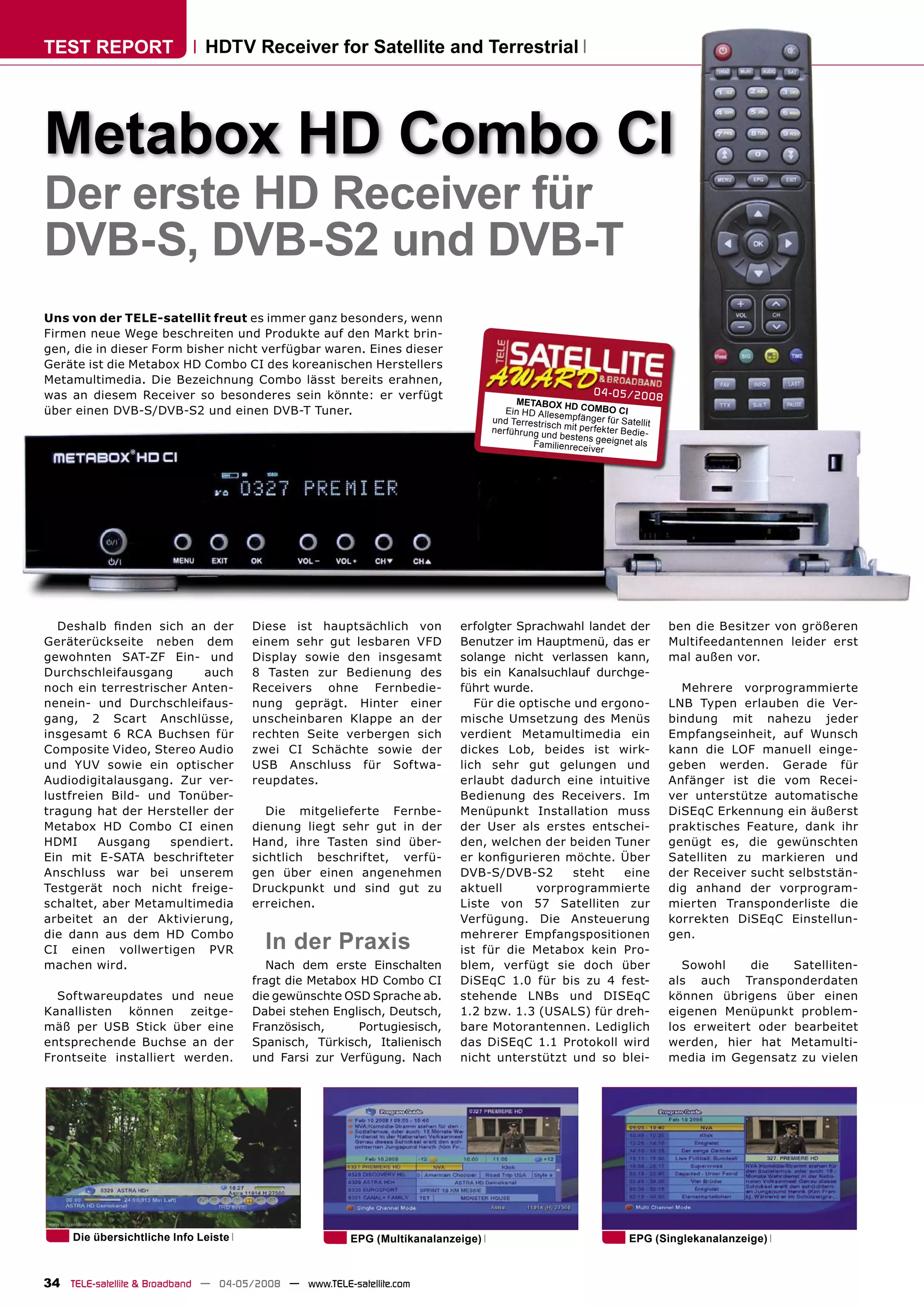 Der Metabox HD Combo CI ist ein innovativer HDTV-Receiver des Herstellers Metamultimedia, der sowohl DVB-S/DVB-S2- als auch DVB-T-Tuner in einem Gerät vereint und damit die gleichzeitige Nutzung von Satelliten- und terrestrischer Empfangstechnik ermöglicht. Die intuitive Bedienung und umfassende Funktionen, einschließlich eines umfangreichen EPG-Systems und einer hohen Kanalspeicherfähigkeit, machen ihn besonders benutzerfreundlich und ideal für Familien. Dieses Gerät unterstützt verschiedene HD-Formate und ist somit eine attraktive Option für Nutzer, die sowohl regionale als auch hochauflösende Fernsehinhalte empfangen möchten.