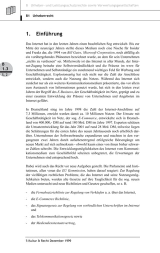 Das Dokument bietet einen Überblick über die Nutzung des Internets für die Kulturarbeit und beleuchtet die damit verbundenen rechtlichen Herausforderungen, insbesondere im Bereich des Urheberrechts. Es wird aufgezeigt, wie das Internet als Kommunikationsmedium für PR und Werbung genutzt werden kann, sowie die Notwendigkeit einer Kostenanalyse und Finanzierungsplanung. Zudem werden verschiedene rechtliche Regelungen, wie die E-Commerce-Richtlinie und das Telekommunikationsgesetz, erwähnt, die die Nutzung des Internets strukturieren.