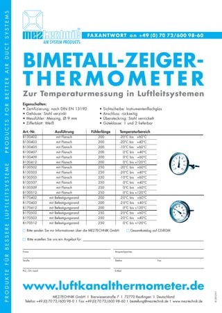 Das Dokument beschreibt verschiedene bimetallische Zeigertemperaturfühler zur Temperaturmessung in Luftleitsystemen, die nach DIN EN 13190 zertifiziert sind. Es listet verschiedene Modelle mit unterschiedlichen Temperaturbereichen und Fühlertypen auf, die sowohl Flansche als auch Befestigungsränder verwenden. Zudem wird auf die Möglichkeit hingewiesen, Informationen über den Gesamtkatalog der Mez-Technik GmbH anzufordern.