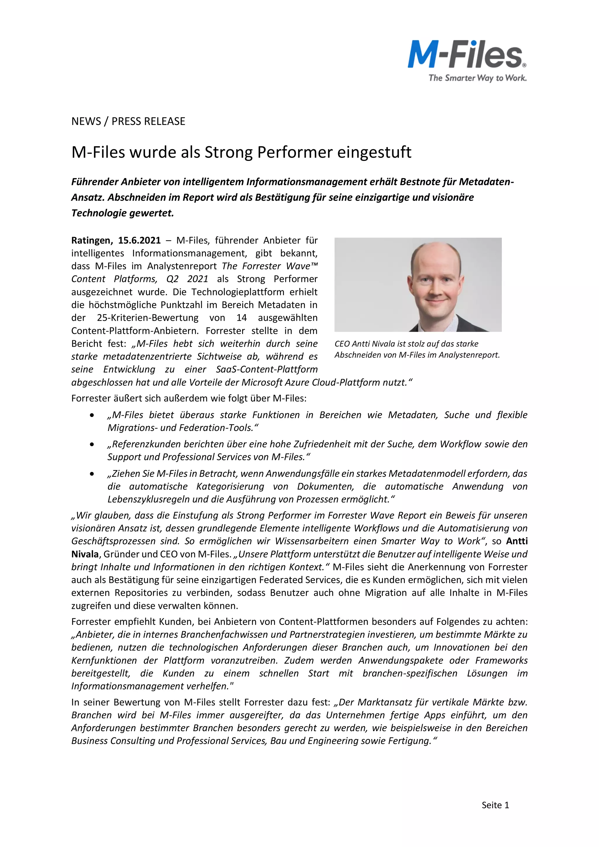M-Files wurde im Forrester Wave Q2 2021 Report als 'Strong Performer' im Bereich intelligentes Informationsmanagement ausgezeichnet, und erhielt die höchste Punktzahl für seinen innovativen Ansatz zu Metadaten. Die Technologie ermöglicht eine verbesserte Informationsverwaltung und wird von Kunden wegen ihrer Flexibilität und Effizienz geschätzt. M-Files kombiniert intelligente Workflows mit Automatisierung, um Wissensarbeitern einen besseren Zugriff auf relevante Informationen zu ermöglichen.