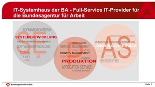 Das Dokument behandelt die Implementierung und den Betrieb von Microservices und Container-Management mit Mesosphere DC/OS im IT-Systemhaus der Bundesagentur für Arbeit. Es beschreibt die Systemarchitektur, Betriebsempfehlungen, Sicherheitsaspekte und Lessons Learned aus einem Jahr Produktionsbetrieb. Es wird betont, dass die Technologie zuverlässig ist und eine gute Akzeptanz in der Entwicklung erreicht wurde, jedoch auch die Notwendigkeit von Automatisierung und standardisierten Vorgehensweisen hervorgehoben.